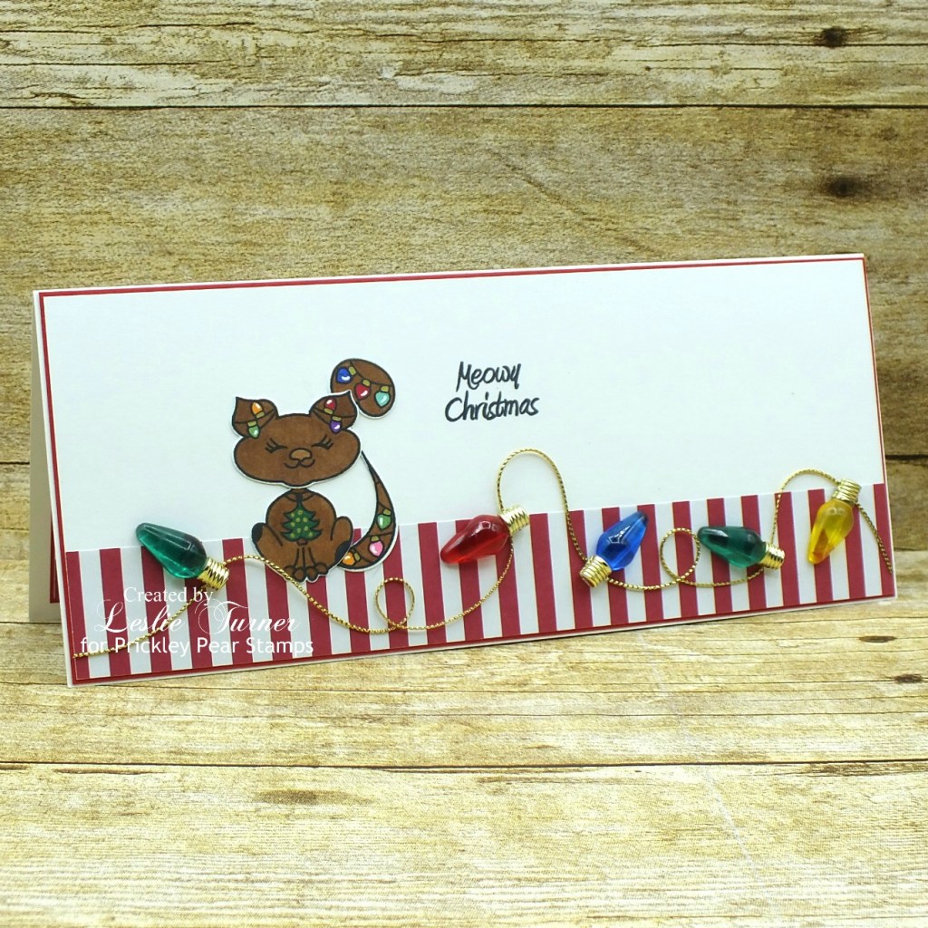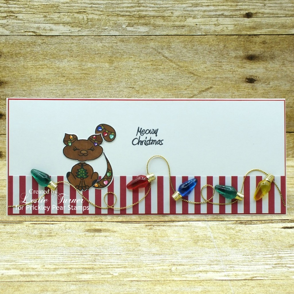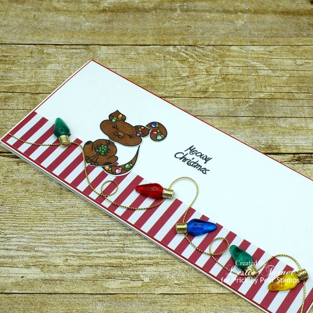 I’ve had these bulbs in my Christmas craft stash for years and when I came across them while digging, I decided I needed to use them! NBUS (never before used schtuff) for sure, lol! I created a 9″ x 3-3/4″ slimline card base along with a white panel for the front from Neenah Classic Crest 110# Solar White cardstock which I embellished with a strip of Canvas Corp red and white striped paper and layered on American Crafts Crimson cardstock. I stamped the sentiment on the panel and the cat on a scrap of Neenah Classic Crest 80# Solar White cardstock. I colored the cat and tail with alcohol markers, cut them with the coordinating dies and adhered them together. I adhered the cat to the panel, then the bulbs and gold cord to complete the card front.