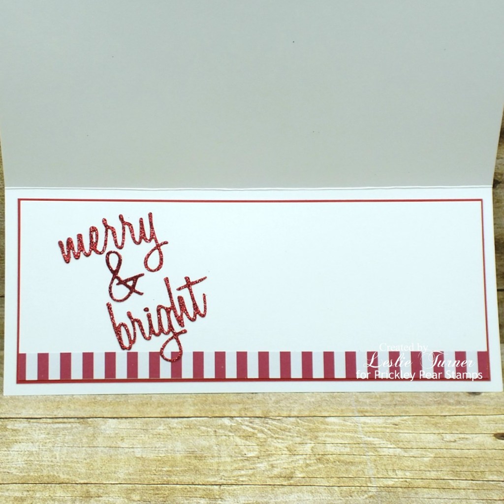 I cut the inside panel from Neenah Classic Crest 80# Solar White cardstock, embellished it with a strip of the red and white paper and a red glitter die cut sentiment, and layered the panel on red cardstock.