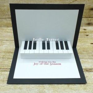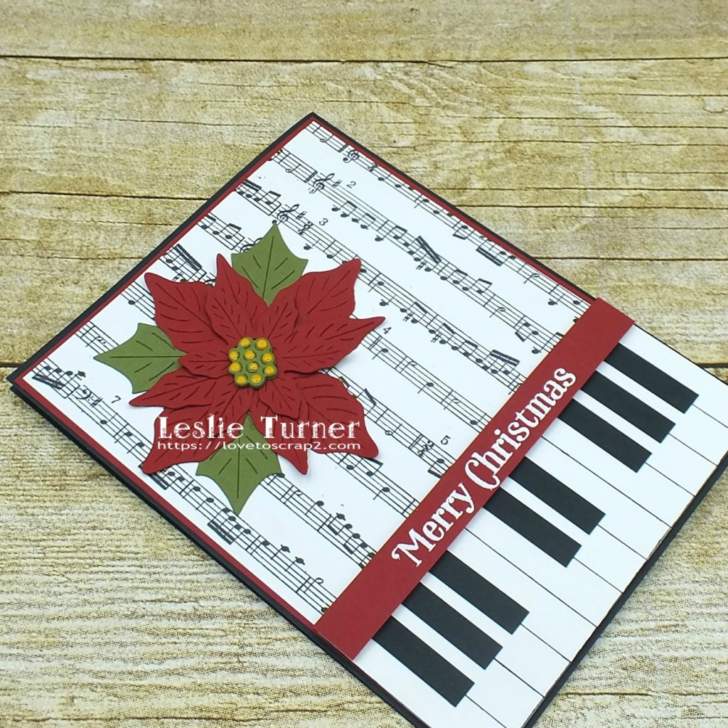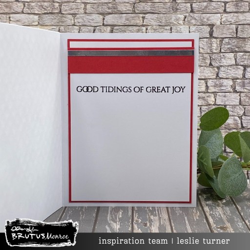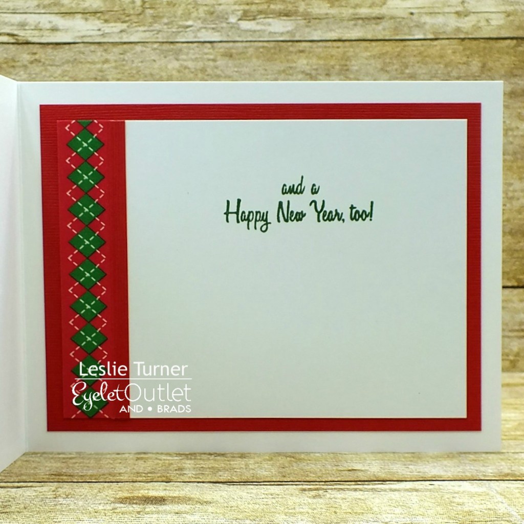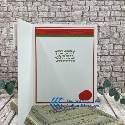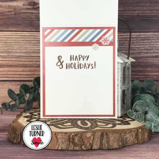 I cut the inside panel from Perfect Blend cardstock and embellished it with strips of Scarlet and CutCardStock Bright Silver Foil cardstock. I stamped a sentiment from the Good Tidings stamp set in Raven ink and layered the panel on Scarlet cardstock.