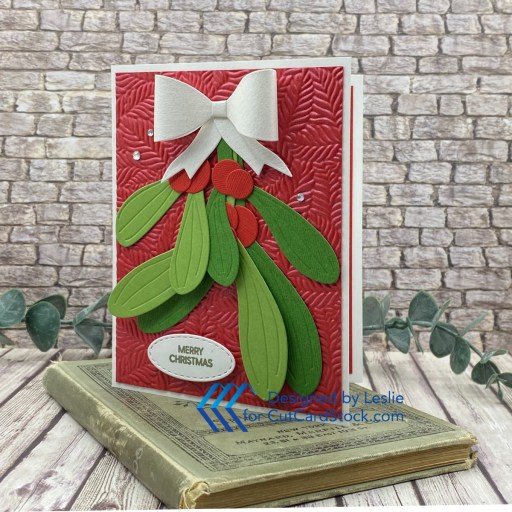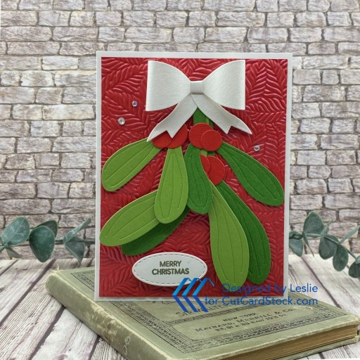 This was an easy card that started with a Pre-Scored A2 Card Base. I cut the trellis background four times from Perfect Blend Cardstock and once from CutCardStock Bright Silver Foil. I layered them all together, sandwiching the silver one between the white ones, and spritzed it with Holly Berry and Ornament Gold Chroma Mists.