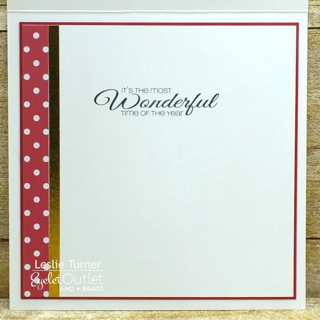 I cut a 5.5″ square top-folding card base along with red dotted and striped cardstock panels. I applied strips of skinny red and green washi tape from the Skinny Holiday Washi Tape pack along with a strip of Skinny Gold Washi Tape at the seam, and then adhered the panel to the card base. I die cut a circular frame on which to build the wreath. I punched a bunch of leaves and adhered them to the frame, and then added single leaves here and there to fill in blank spots. I embellished the wreath with several Poinsettia Brads and 6 mm Red Gold Edge Jewel Brads, and a red bow at the bottom. I stamped the sentiment across the bottom and then adhered the wreath to the card front.