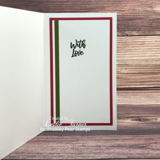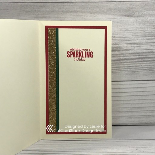 I cut the inside panel from CutCardStock Basis Natural cardstock and embellished it with leftover strips of patterned paper and red cardstock used on the front. I stamped a sentiment from the Taylored Expressions In & Out Christmas stamp set in Catherine Pooler Black Jack ink.