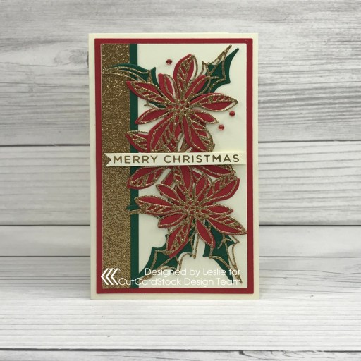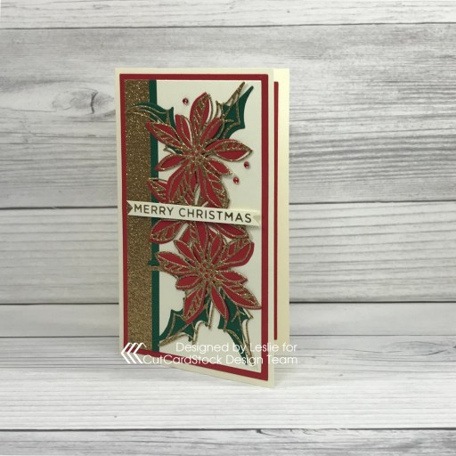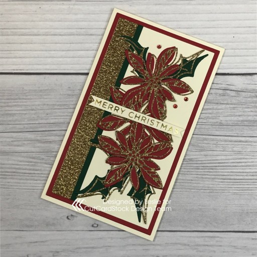 I cut a 3-1/2″ x 6″ mini slimline card base from CutCardStock Basis Natural along with a layering panel from CutCardStock Basis Red. Using the Kat Scrappiness Mini Slimline Scalloped Edge Dies, I die cut a panel from a pretty patterned paper from the Carta Bella Christmas Collection Kit. Then, using the Kat Scrappiness Mini Slimline Tri-Frame Dies, I die cut a frame from another Carta Bella paper. I used ‘merry Christmas’ sentiment stickers from the Carta Bella kit. I cut a small Stampin’ Up doily roughly in half and adhered the smaller piece to the bottom left corner and adhered a bow fashioned from a piece of hemp crafting cord. The final touch was adding some small dots of Glossy Accents to the berries on the patterned paper.