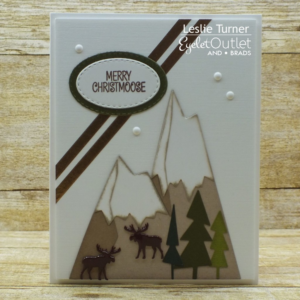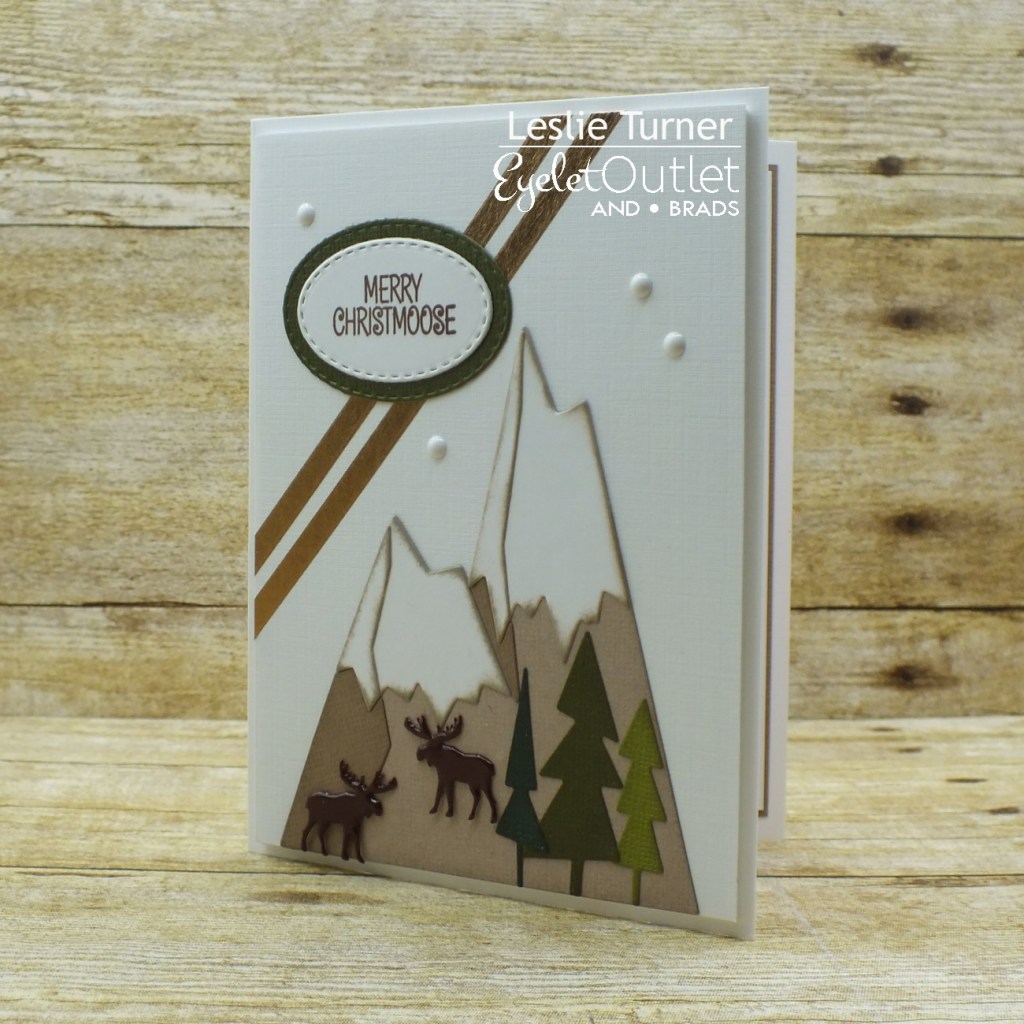 I cut a standard A2 size side-folding card base from Neenah Classic Linen 100# Solar White cardstock along with a layering panel for the front from Neenah Classic Linen 80# Solar White cardstock. I die cut the Alpines from Neenah Classic Crest 80# Solar White cardstock (snow caps) and an assortment of papers from the Core’dinations Kraft-Core Nostalgic Collection, and inked the edges of the pieces with pumice stone distress ink before assembling them. I added two Moose Brads and adhered the Alpines to the linen layering panel. I added two angled strips of Copper Skinny Washi Tape, adhered the panel to a piece of white craft foam and then adhered the piece to the card base. I stamped the sentiment in brown ink, cut it with a stitched oval die and layered it on a slightly larger green die cut, and adhered it to the background panel. The finishing touch was the addition of several White Enamel Dots.