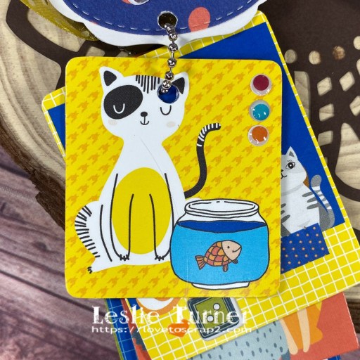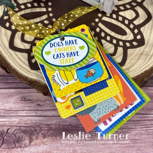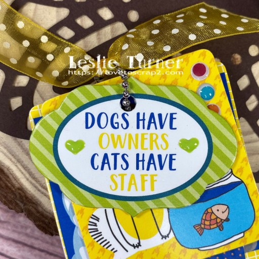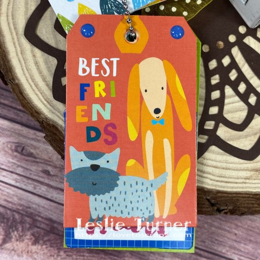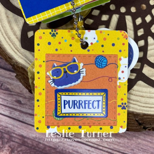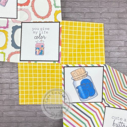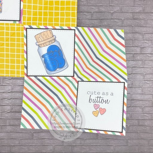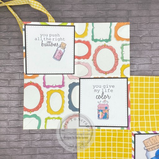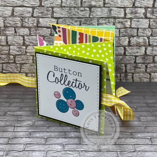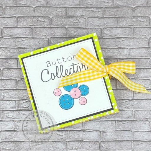 I chose several brightly colored double-sided papers from the Stamp & Scrapbook Expo Crafty Girls Flip Sides Pack, along with images and sentiments from the Beccy’s Place Button Collector digi set which I printed on CutCardStock Cougar Smooth 80# White cardstock. I cut the images with a Keep It Simple Back To Basics Stitched Squares Nested Die and layered them on CutCardStock Lessebo Pitch Black cardstock. I popped the front image up on double-sided foam strips so I could tuck the ribbon closure under it.