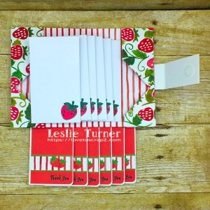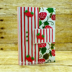 I used Stampin’ Up Fruit Stand DSP and chose a strawberry pattern on one side with stripes on the reverse side to create the folio. I embellished it with small die cut strawberries and green flat-back pearls, and I created a band with a velcro closure. I used a fun Prickley Pear Stamps clear stamp set for the front and inside sentiments, as well as the strawberry stamped on the envelopes. Here are shots of the folio closed, open and one with the cards and envelopes displayed.