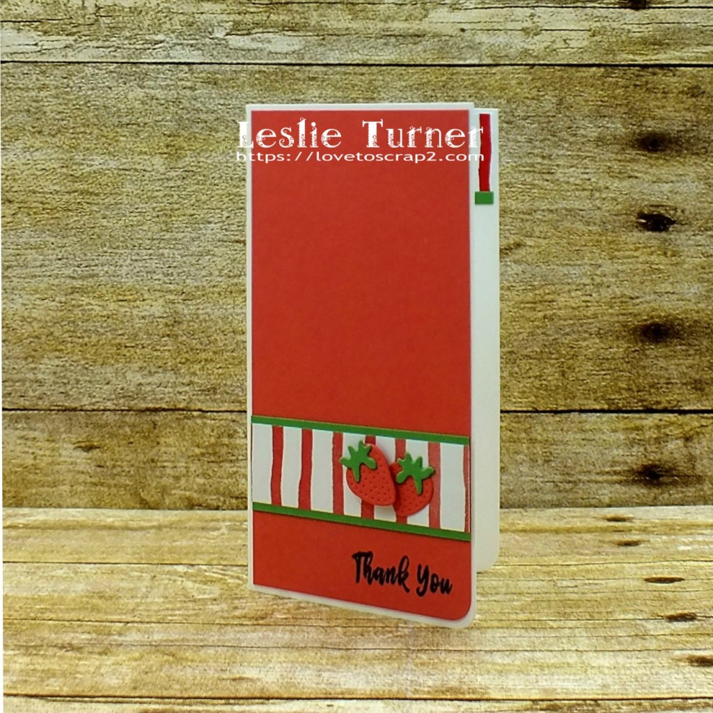 I embellished each card front with a strip of striped pattern paper layered on Stampin’ Up Cucumber Crush cardstock and two small die cut strawberries. I stamped the sentiment in the bottom right corner in black ink which completed the card front.
