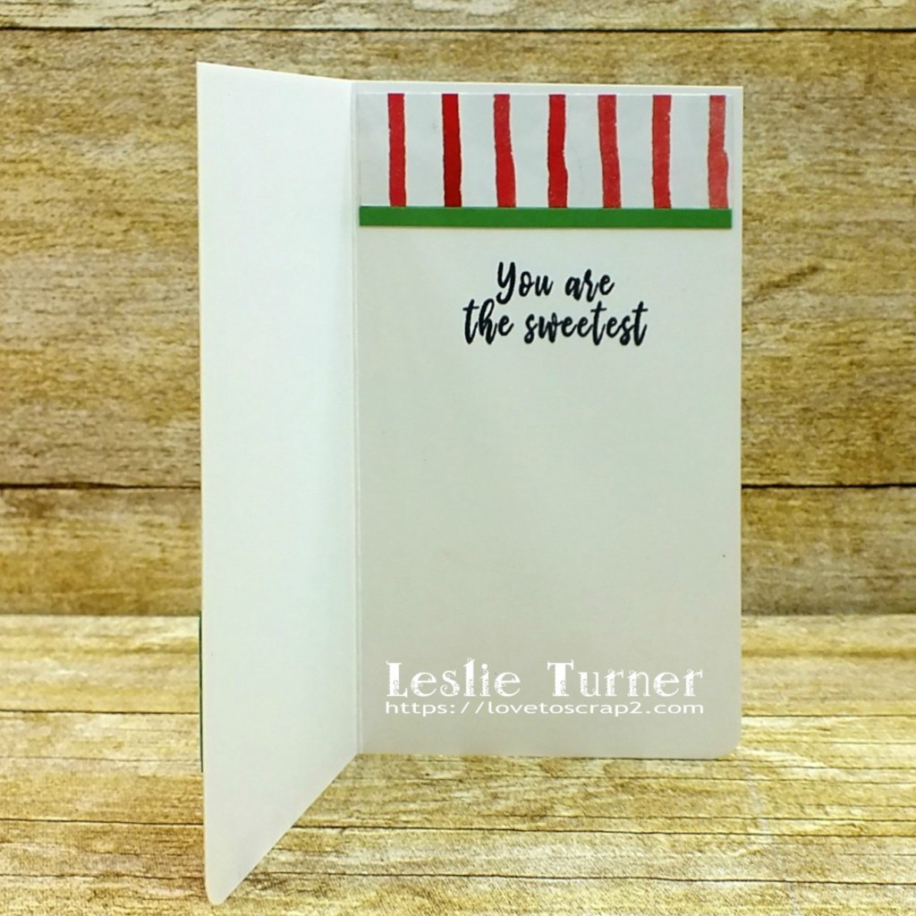 I embellished the inside with a strip of the striped pattern paper and a narrow strip of the green cardstock, then stamped the sentiment in black ink.