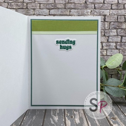 I cut the inside panel from 80# Solar White cardstock and embellished it with leftover strips of the Galax and Sweet Mint cardstock. I stamped another sentiment from the Catherine Pooler Flourishes & Sentiments stamps in her Sea Glass ink, cut it with the coordinating die, and layered the panel on Celebration Warehouse Seafoam Green Smooth cardstock.