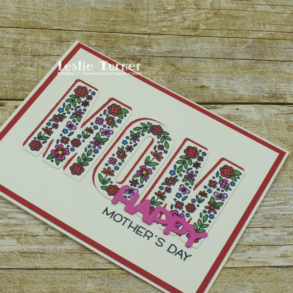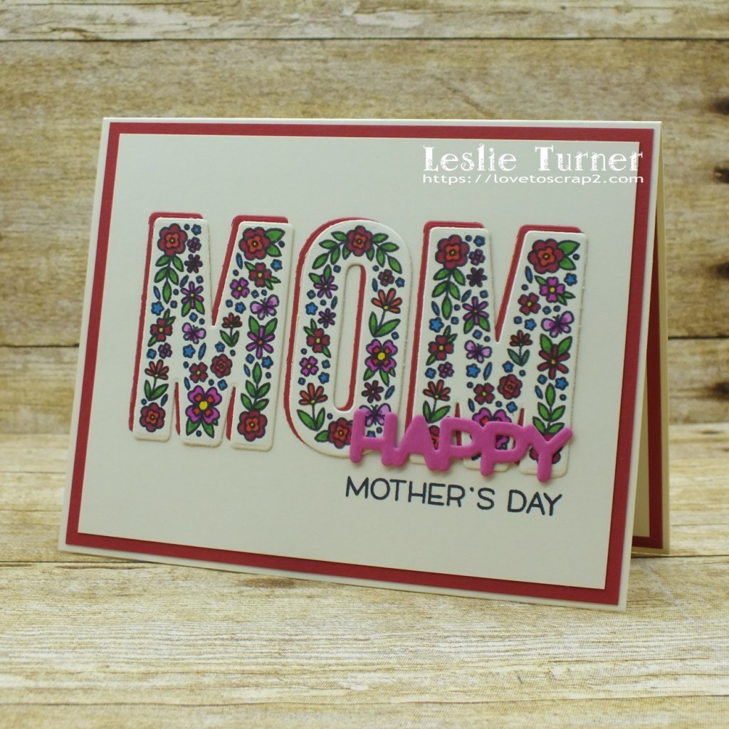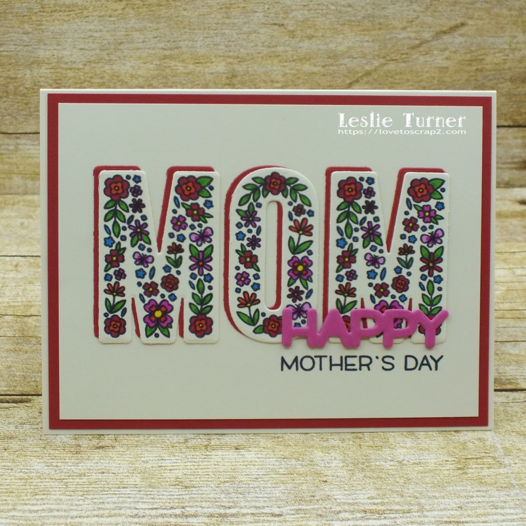 I stamped the floral MOM letters on Neenah Classic Crest Baronial Ivory cardstock, colored them with Bic Mark-Its and die cut them with the coordinating dies. I cut a standard A2 size top-folding landscape card base and layering panel from Neenah Classic Crest Baronial Ivory cardstock along with a slightly larger layering panel and another set of MOM letters from CutCardStock Basis Red cardstock. I die cut the word ‘happy’ from CutCardStock Raspberry Ice cardstock thinking ‘never in a million years would I have ever thought I would pair pink with red’ – but it totally worked on this design! I adhered the layering panels together, then adhered them to the card base. I adhered the floral letters to the red cardstock letters, off-setting them just a bit, and adhered them to the card front. I stamped the sentiment in black ink beneath the die cut letters, and the finishing touch was adding the pink die cut ‘happy’ just above the sentiment.
