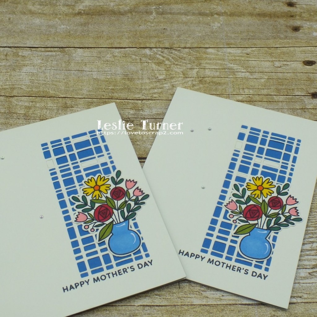 I cut a standard A2 top-folding card base from Neenah Classic Crest Baronial Ivory 80# cardstock and ran the bases through the Big Shot with one of the dies from the Sizzix Festive Repeat Thinlits set, leaving a few of the tiny bits in the apertures (as I did with the Mother’s Day Wreath card) for a little interest. I backed the apertures with a panel of blue cardstock and added a stamped, colored and die cut vase of flowers from the Pretty Pink Posh Mother’s Day stamp set to each card front. I stamped the sentiment in black ink and added a few tiny iridescent gemstones to finish off the card fronts.