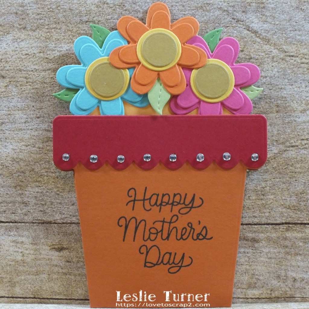 I dug into my Papertrey Ink cardstock stash and used Canyon Clay and Pure Poppy for the flower pot, along with scraps of Prairie Grass, Bright Buttercup, Orange Zest, Tropical Teal, Raspberry Fizz, New Leaf, and Vintage Jadeite cardstock for the flowers and leaves. I stamped the sentiment in black ink on the front of the flower pot prior to assembling it, and once assembled, I embellished it with small clear gemstones.