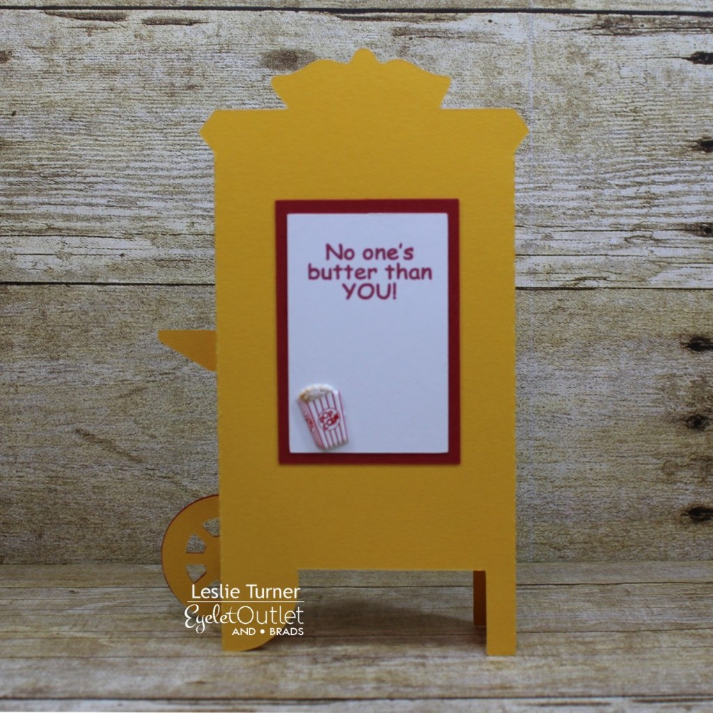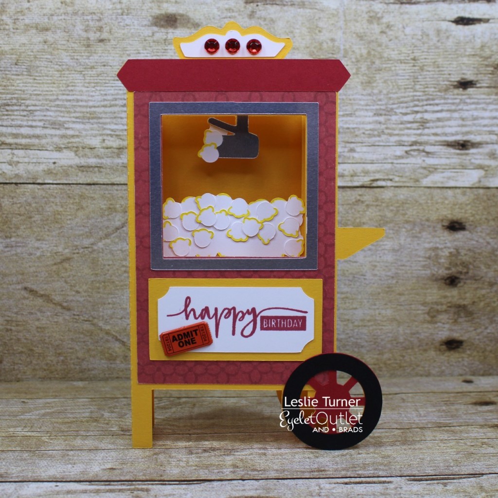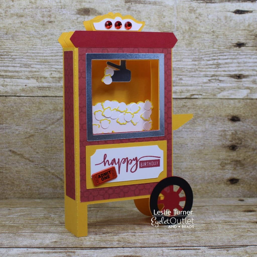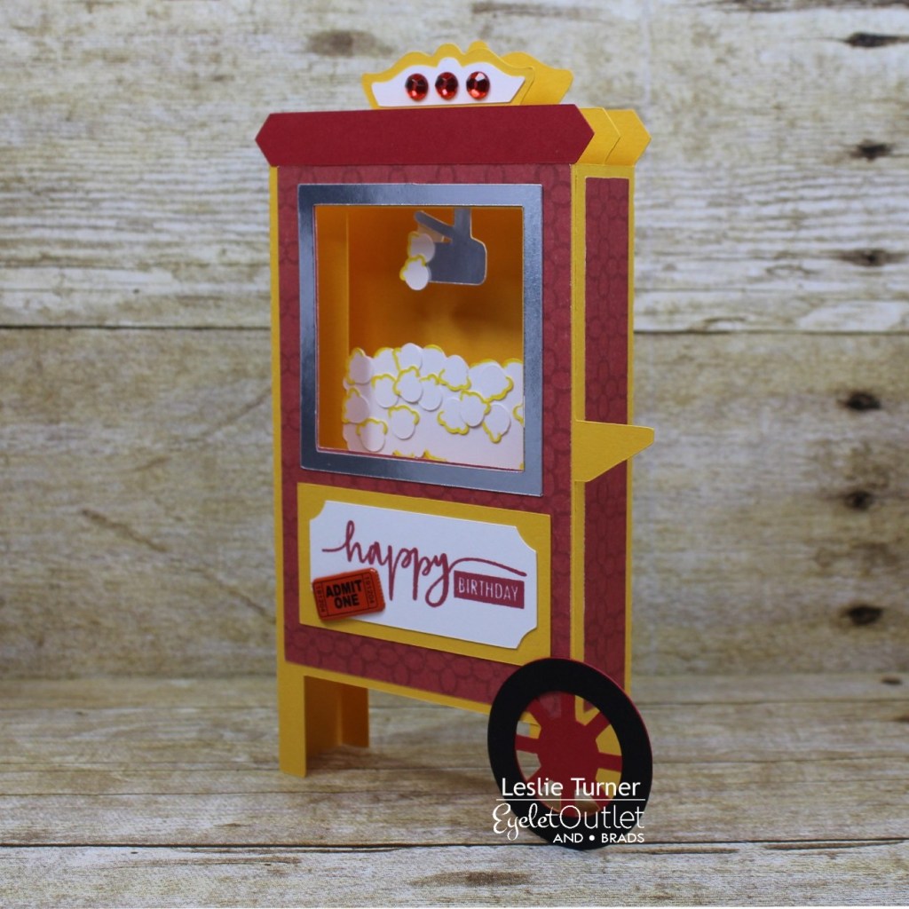 Hi everyone! A very Happy Saturday to you – I hope you’ve had a great week! Things are status quo here. The hubs had a pinched ulnar nerve released in his left arm several days ago and is doing well. I have to keep reminding him to take it easy and not over use his arm… you know how men are! ;) Affiliate links are used in this post at no cost to you. I really appreciate your support! I’m thrilled to be back on the Eyelet Outlet blog today with another awesome DT inspiration project! I created a fun birthday popcorn machine box card featuring our Popcorn & Ticket Brads and Red Jewel Bling! This was definitely a fun one! My Scan N Cut lives in a cabinet to keep it from getting dusty, and when I bring it out, I typically cut multiple files which keep me busy assembling for weeks to come. ;)
