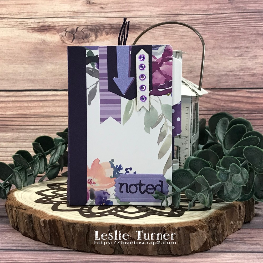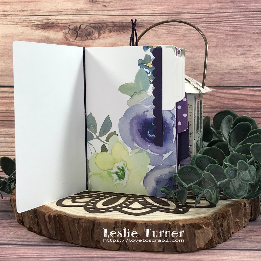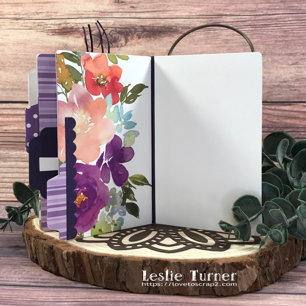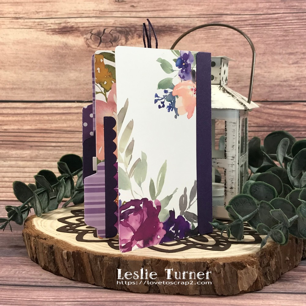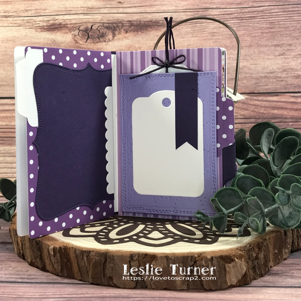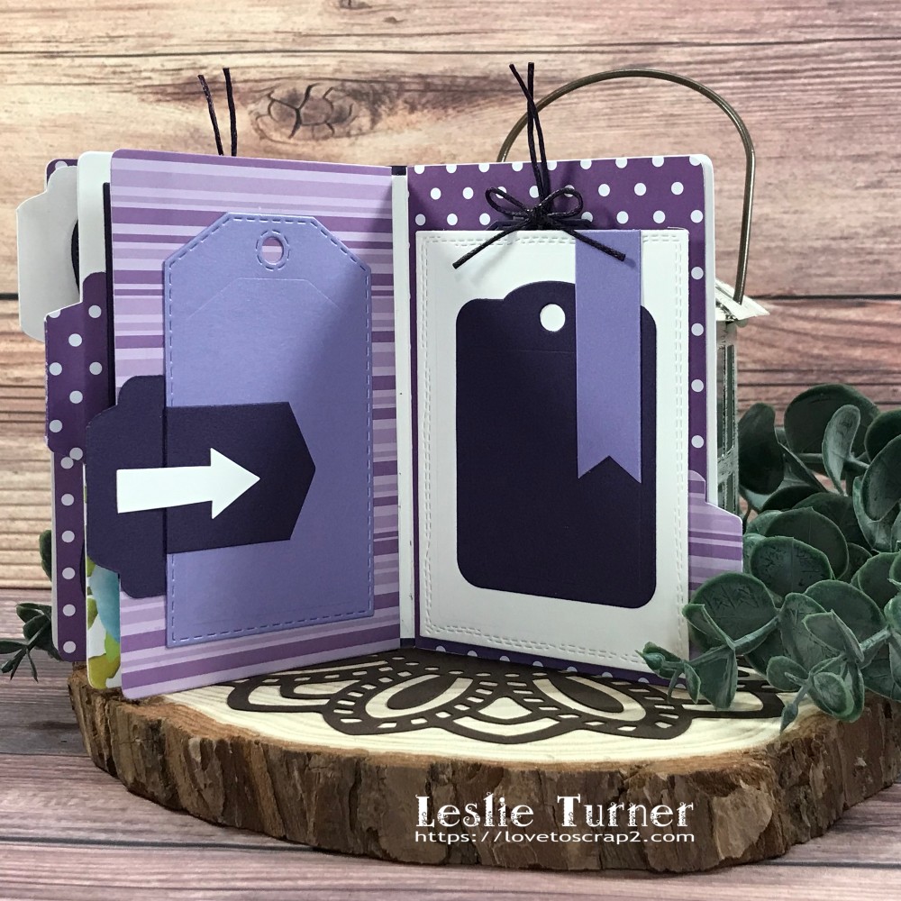 I die cut the album and pages from STAMPlorations Spring Florals A2 Card Fronts and Darice Dots and Stripes cardstock. Using a variety of Sizzix and CUTplorations dies, I die cut elements from Solar White cardstock, CutCardStock Stardream Metallic Amethyst cardstock, CutCardStock Basis Dark Purple cardstock and Darice Dots and Stripes cardstock to embellish the pages. Several of the pages inside have pull-up tags. I added an arrow and gemstones to the front which completed the album.