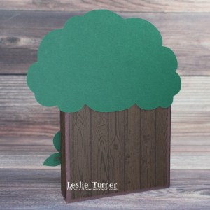 I cut all the pieces from Stampin’ Up Chocolate Chip cardstock, CutCardStock Basis Brown, Basis Light Brown, Basis Green, Basis Black, Basis White, and Pop-Tone Tangy Orange cardstock. I used the Stampin’ Up Hardwood background stamp on the tree layering pieces, stamped in Catherine Pooler Icing On The Cake ink.