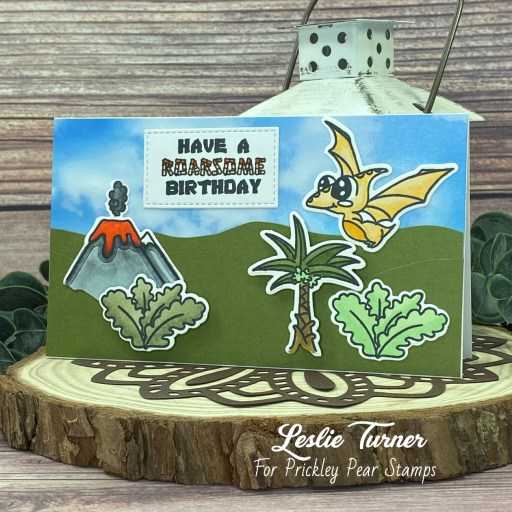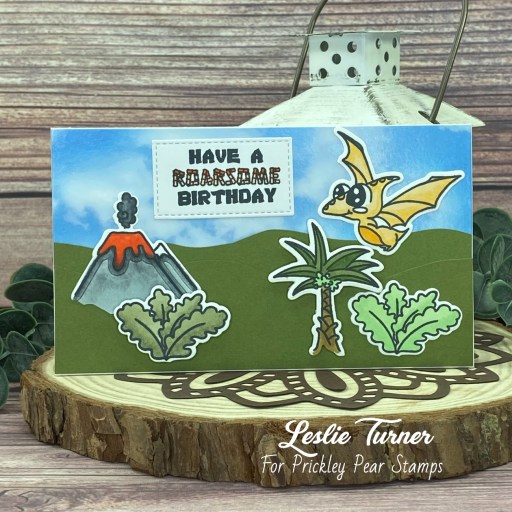 Hey everybody! Happy Tuesday! Could you please tell me what happened to the month of June?! I’ve popped in with the LAST Pajama Crafter Stamps project in that humongous pile of projects I created prior to leaving the team at the end of February and hadn’t yet showcased. It took just barely over four months to share them all and I sure have enjoyed it. SO many awesome stamps and dies from Prickley Pear Stamps and the new Pajama Crafter Stamps! This adorable birthday card features the Dinosaur Pals stamps and dies from Prickley Pear Stamps and creating this little scene was a lot of fun.