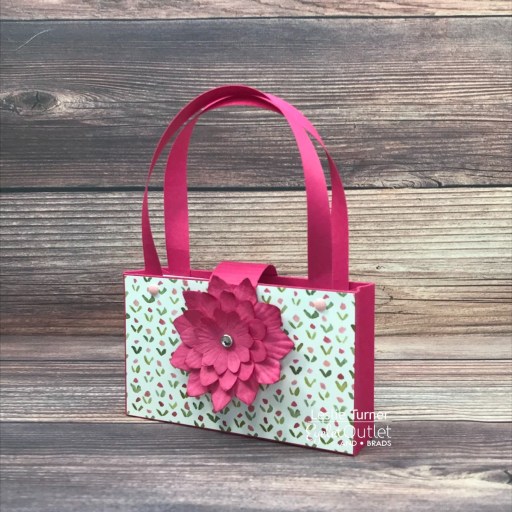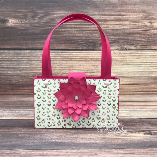 I cut the purse base and handles from CutCardStock Amaranth cardstock and adhered patterned paper panels to the front and back. I scored the flap in 1/8″ increments in a section so it would curve appropriately. I adhered a large Dark Pink Paper Flower held together with a Silver Edge Clear Jewel Brad to the flap and affixed a tiny magnet closure. The finishing touch was adding two Pink Enamel Dots to the front just under the straps.