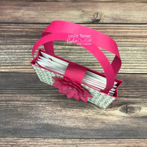 Hi everyone! A very Happy Saturday to you – I hope you’ve had a great week! Affiliate links are used in this post at no cost to you – I really appreciate your support! I’m stoked to be back on the Eyelet Outlet blog today with another awesome DT inspiration project! I created a cute little Chandler purse with a set of six notelets featuring our Dark Pink Paper Flowers, Silver Edge Clear Jewel Brads and Pink Enamel Dots. I followed the Bearly Art tutorial HERE but with a couple modifications… I made my clasp slightly different and I attached two handles rather than just one.