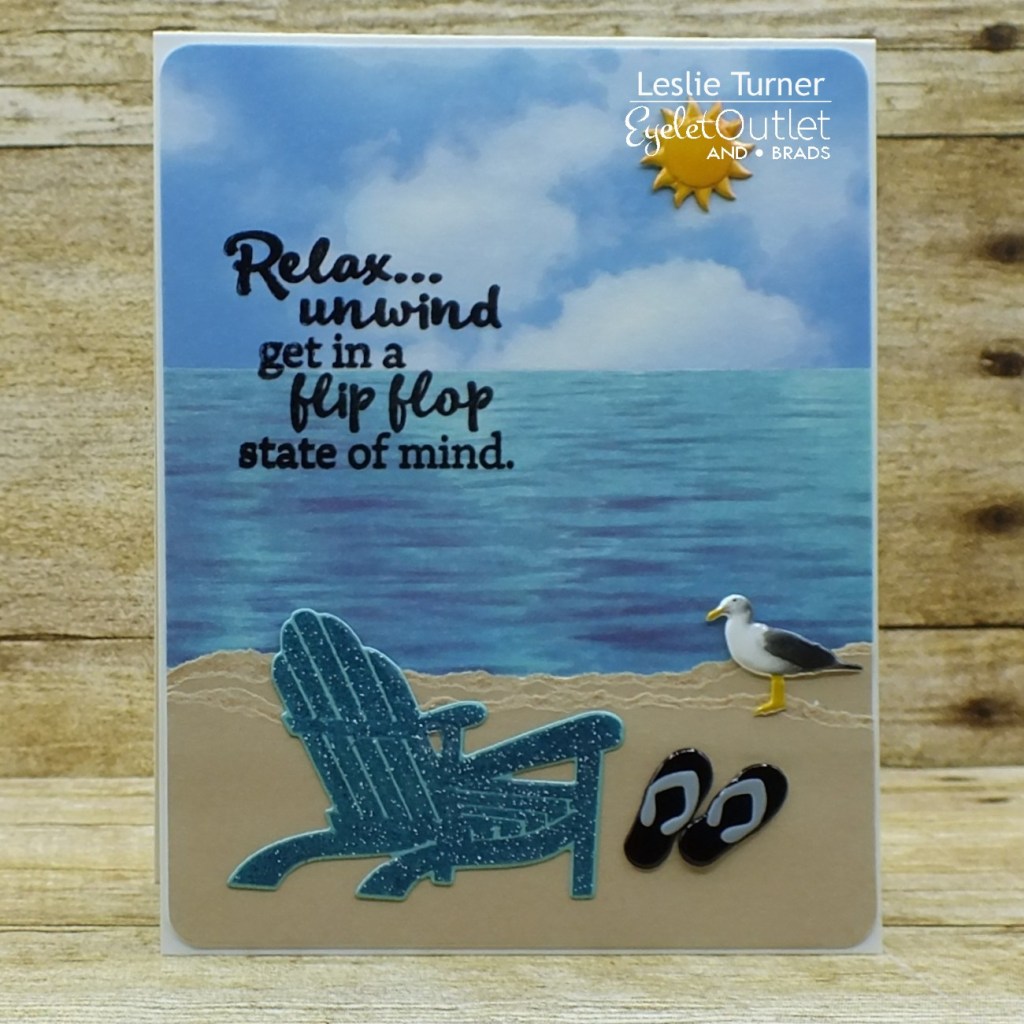 Hi everyone! Another Saturday has rolled around and we are that much closer to Christmas! Yaaaaay, my favorite time of year! We literally have just a couple months of hot weather out here in Colorado (that’s why we moved here) so we’re looking forward to some cooler temps coming! We have very little humidity so the hot and cold temps are much easier to tolerate. I’m happy to be back on the Eyelet Outlet blog today with another awesome DT inspiration project! I created a beach card featuring some of the new Flip Flop Brads that hit the store a few days ago… they are so cool! And of course, I had to pair them with a Sun Brad and a Seagull Brad along with Wide Sky Washi Tape and the Water Washi Tape to complete the beach scene!