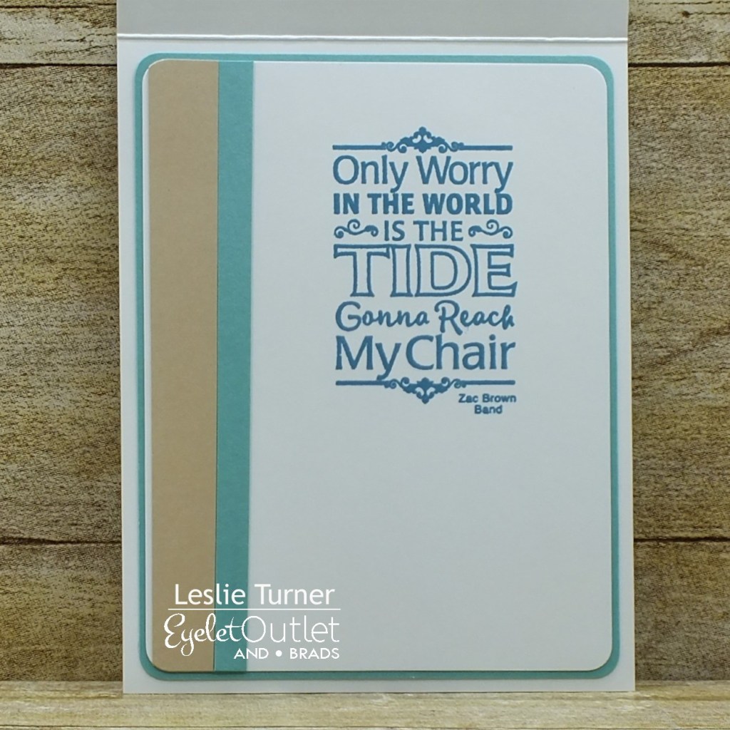 I cut the inside panel from Neenah Classic Crest 80# Solar White cardstock along with a layering panel and embellishing strip from CutCardStock Stardream Metallic Lagoon cardstock, and a wider embellishing strip from CutCardStock 80# Sandcastle cardstock. I adhered the strips, rounded all four corners and stamped another sentiment from the Dare 2B Artzy Flip Flops Stamp Set in Teal Zeal ink, then layered the panel on the lagoon cardstock.