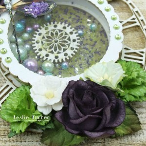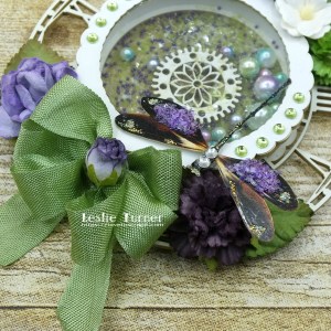 I embellished the outside of the box with paper flowers and leaves, green bling, a green bow and a purple dragonfly. The small green flower, the small white flower and the large green flowers are from my stash. I inked the two large flowers (which started out white) with Tattered Angels Moss Glimmer Mist. I fashioned a triple loop bow from green seam binding in my stash.