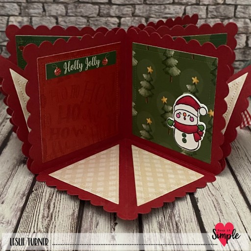 I used our new KIS Cuts Scallop Circular Pop-Up dies to cut the base from CutCardStock Lessebo Dawn Maroon cardstock along with stitched square layering panels cut from assorted prints in the Here Comes Santa Claus 6×9 Collection Pack. I stamped several images from the Here Comes Santa Claus Collection Stamps on CutCardStock Basis White in Memento Tuxedo Black ink and colored them with alcohol markers. I cut them with the coordinating Outline Dies and used them to embellish the sections of the pop-up.
