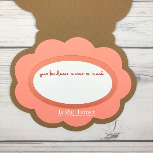I cut the large scalloped inside panel from CutCardStock Basis Coral cardstock and the remaining two layers from CutCardStock Stardream Metallic Flame cardstock and Neenah Classic Crest Solar White cardstock, and adhered them to the inside of the card base. The final step was stamping the sentiment from the Altenew Build-A-Flower Hibiscus stamp set in Catherine Pooler Mandarin Spice ink.