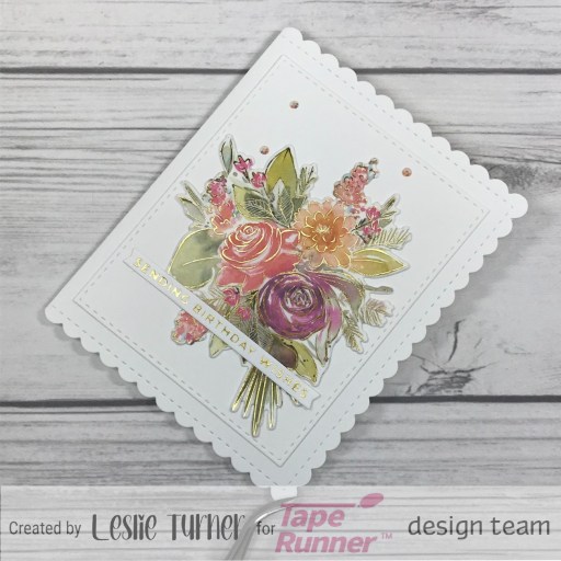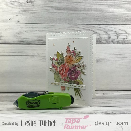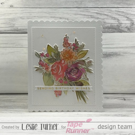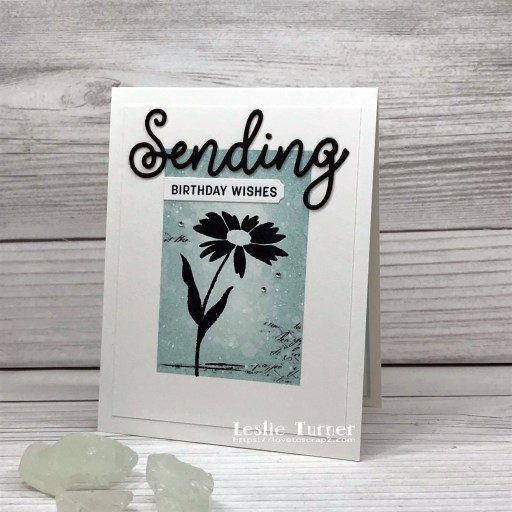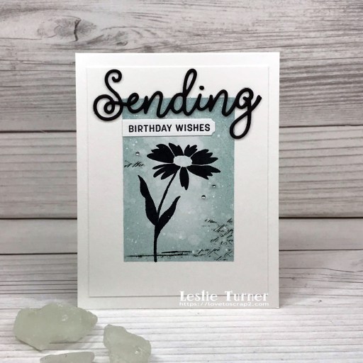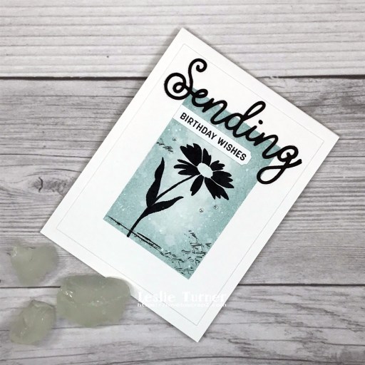 I carefully removed the blue masking tape from the sides and top of the panel (leaving the bottom tape on the panel), took it off the epicurean board and put it in the MISTI. I stamped the floral silhouette image in Memento Tuxedo Black ink and gave it a minute to dry. I put the panel back on the epicurean board and re-taped the sides and top with blue masking tape. I laid flower and stem die cuts (using the Stampin’ Up Sending die set) over stamped image and splattered white acrylic paint mixed with a tiny bit of water over the panel with a brush. I hit the panel once more very briefly with my heat tool, trimmed it, and adhered it to the card base.