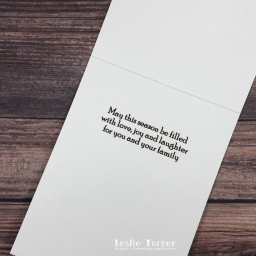 I stamped the inside sentiment from the same Prickley Pear Stamps Two Snow Ladies stamp set in Catherine Poole Icing on the Cake ink, and this completed the card.