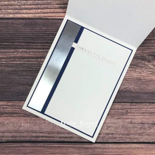 I cut the inside panel from CutCardStock Basis 80# White cardstock and embellished it with a wide strip of the silver metallic foil cardstock and a narrow strip of CutCardStock Basis Blue cardstock. I added another foiled sentiment and layered the panel on the blue cardstock.