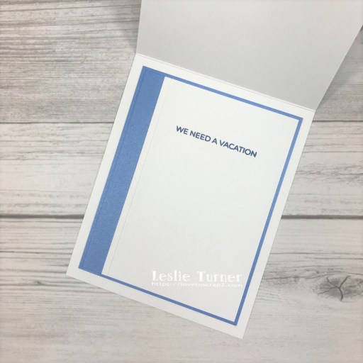 I cut the inside panel from CutCardStock Basis 80# White cardstock and embellished it with a strip of CutCardStock Stardream Metallic Vista cardstock. I stamped the sentiment from the same Trinity Stamps Summertime Sentiments stamp set in Catherine Pooler Cove Blue ink and layered the panel on the metallic blue cardstock.