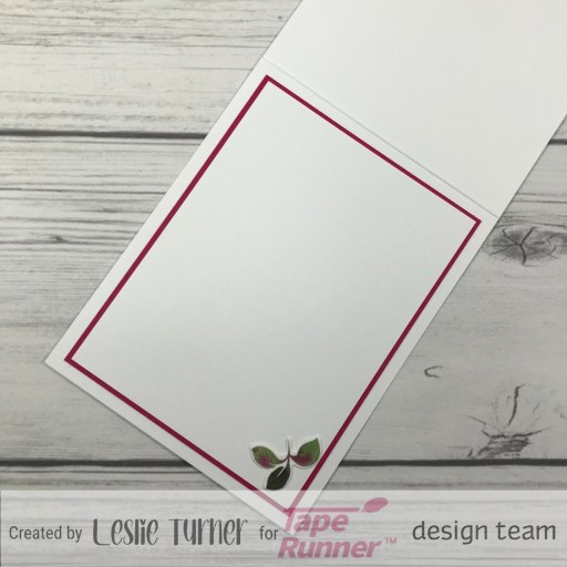 I cut the inside panel from Neenah Classic Crest 80# Solar White cardstock and embellished it with some small leaves created with the PinkFresh In The Meadow Washi Tape and cut with the coordinating die. I layered the panel on CutCardStock Amaranth cardstock which completed the card.
