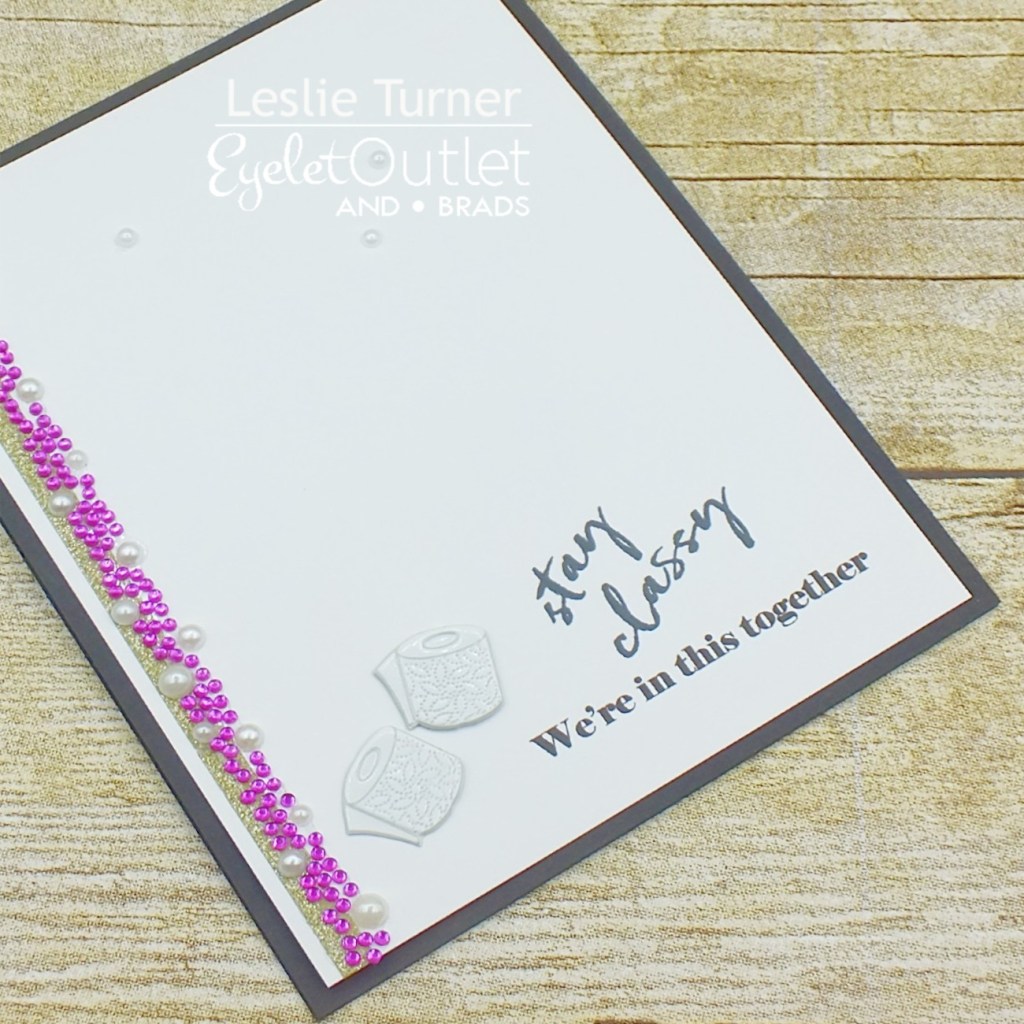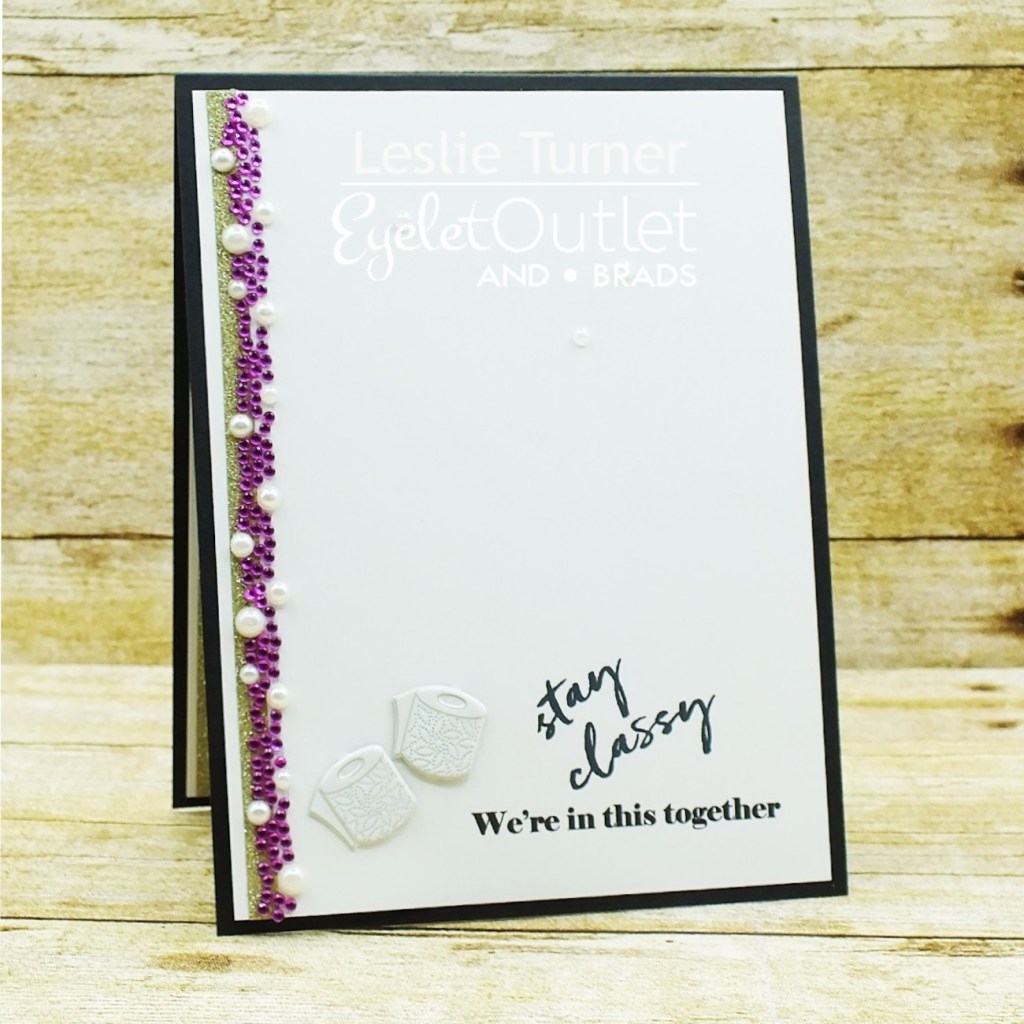 Hi friends! How’s the weather where you are? It’s still pretty chilly here in southwestern Colorado but we’re definitely not sad about it – we moved out here from Florida almost four years ago to retire in cooler climate! Affiliate links are used in this post at no cost to you. I really appreciate your support! I’m happy to be back on the Eyelet Outlet blog today with another awesome DT inspiration project! This is the last card in my series of clean and simple cards paying tribute to our frontline healthcare workers. This one is lighthearted with computer-generated front and inside sentiments and an added stamped sentiment on the front to tie in the glitz and glam from the washi tape and fancy long bling!