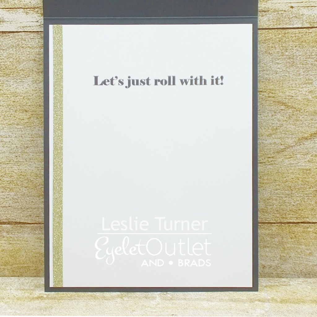 I cut a standard A2 size top-folding card base from black cardstock. The front and inside sentiments are computer-generated and printed on Neenah Classic Crest Solar White 80# cardstock. I trimmed the panels and stamped the ‘stay classy’ sentiment at an angle just above the front sentiment. I added a strip of Gold Glitter Skinny Washi Tape and Pink Fancy Long Bling-Pearls & Jewels vertically down the left side, added two Toilet Paper Brads just to the left of the sentiment, and adhered the panel to the card base.