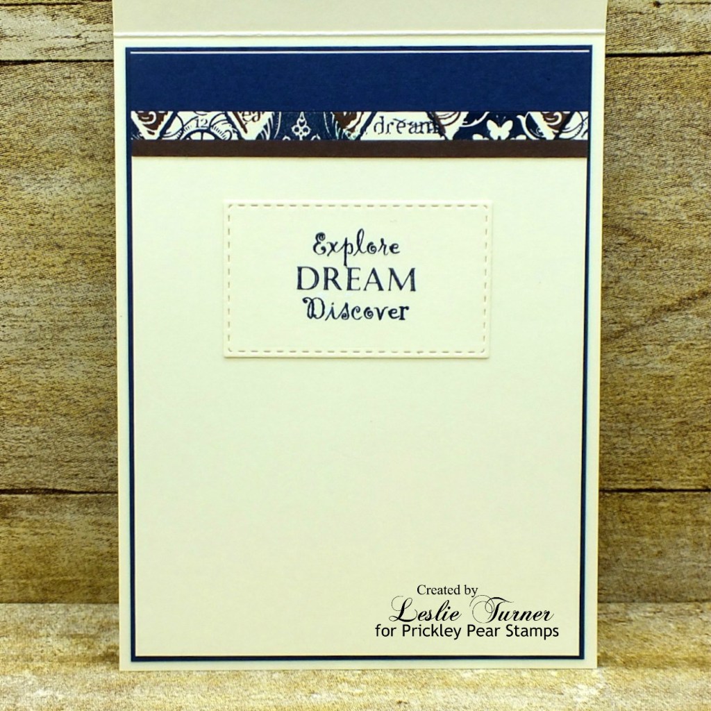 I embellished the inside panel with a leftover strip of the trimmed stamped panel on the front which I complimented with brown and navy cardstock strips. I stamped the sentiment and cut it with a stitched rectangle die, and layered the panel on blue cardstock.