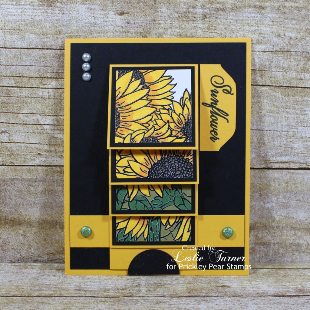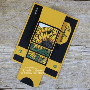 Hi everybody! Is it cold where you are?! We’re having a heat wave here this morning – it’s up to 37 degrees from 13 and 22 degrees the last couple mornings, lol! We got a few inches of snow several days ago and some of it is still on the ground, and we sure do love it! Affiliate links are used in this post at no cost to you – I really appreciate your support! I discovered that I still have a few card samples I created for Prickley Pear Stamps to share using stamp sets in their Sketched Florals line. This pretty waterfall card (only the second one of these I’ve ever made) features the Sketched Florals Sunflower stamp set along with their Shadow Words Thank You die which I absolutely love.