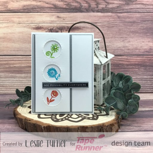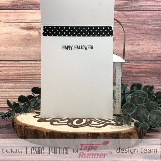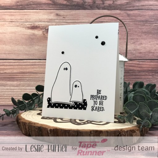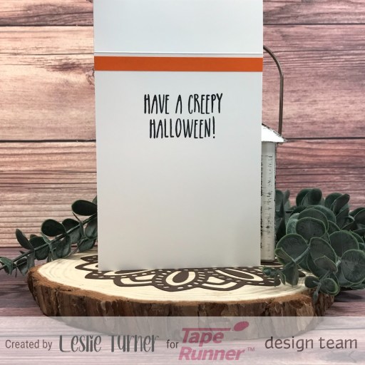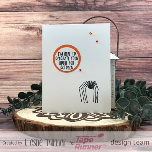 Hi everyone! Happy Friday – I hope you’ve had a great week and you’re looking forward to doing something fun this weekend! I have an awesome Tape Runner DT inspiration project to share with you today. I’ve been in a ‘clean and simple’ mode and this Halloween card features the spider from Creepy Halloween, another stamp set from The Project Bin. That hilarious spider is the star of the show and the punched sentiment circles are the only layers on this card, and they were adhered with Tape Runner. This would be a great card to mass produce if you send out a lot of Halloween cards!