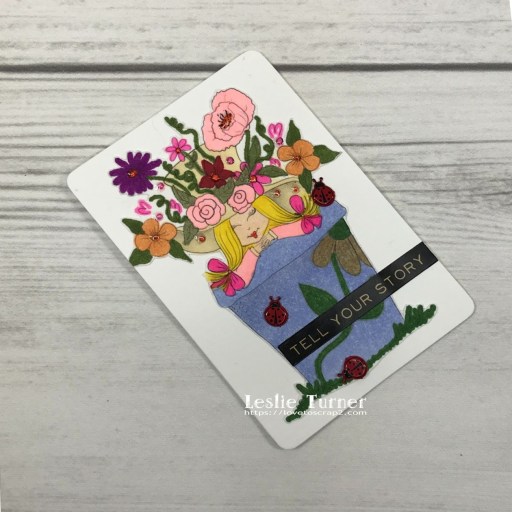 I cut two standard 2-1/2″ x 3-1/2″ ATC blanks from CutCardStock Basis 110# White cardstock and rounded the corners. I printed the digital image on CutCardStock Basis 80# White cardstock, colored it with alcohol markers, and fussy cut it leaving a very narrow margin around the image. I adhered the image to one of the ATC blanks, added three Eyelet Outlet Mini Lady Bug Brads (where the lady bugs were drawn on the image), and adhered the second ATC blank to the back. I applied tiny dots of Ranger Glossy Accents to the centers of each flower and the dots on the image, and added a Tim Holtz Quotations Metallic Sticker which completed the ATC.