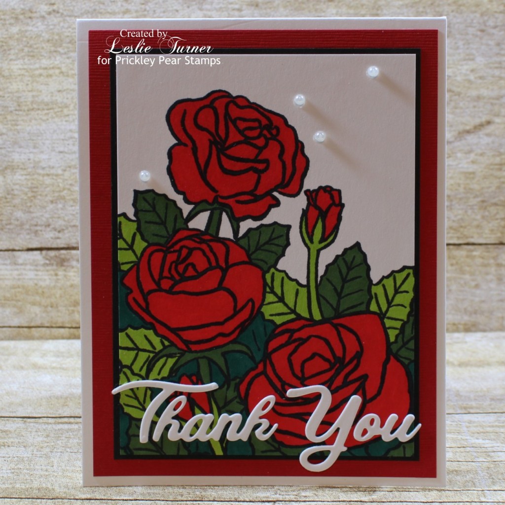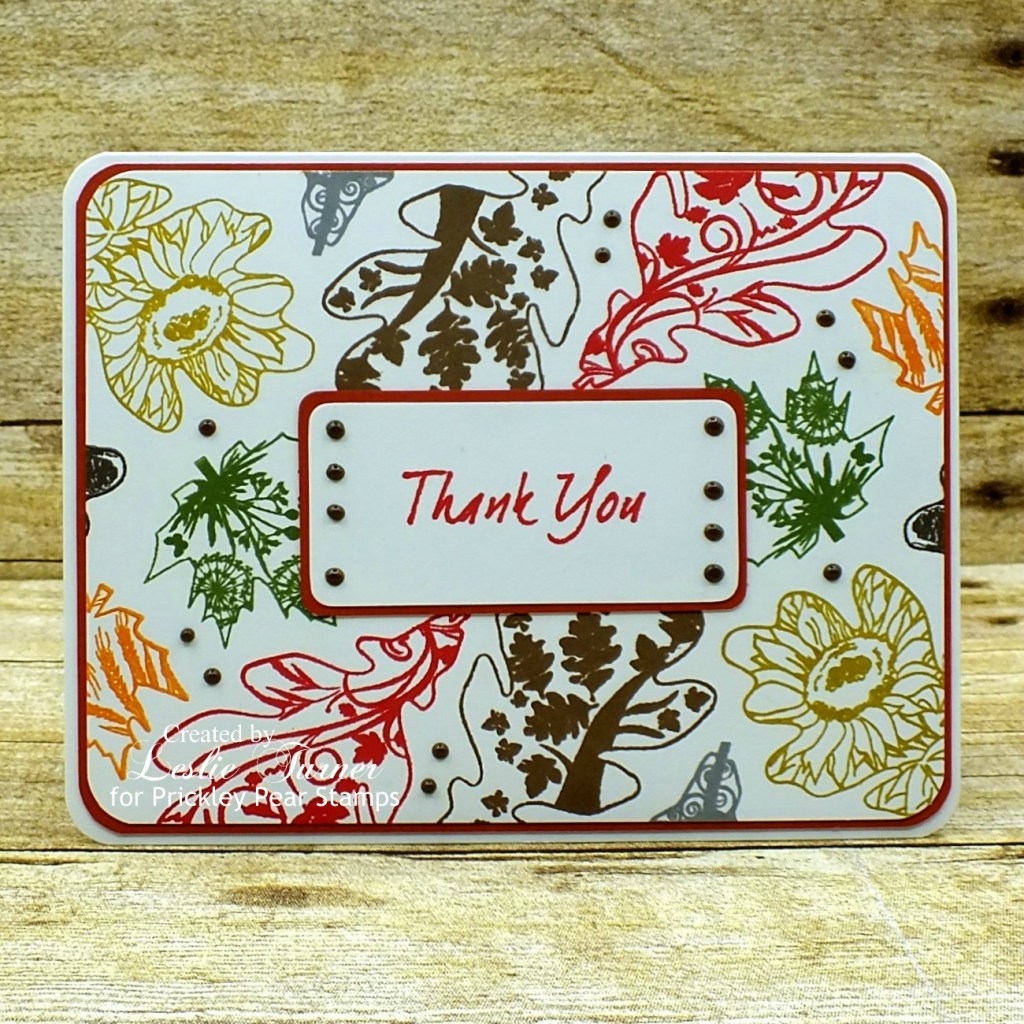Hi everyone! I hope you’re having a great week! It’s turned quite chilly here – a mere 21 degrees when we got up at 3:30 AM this morning – and we love it! Affiliate links are used in this post at no cost to you – I really appreciate your support! I am once again making time to play in The Outlawz Challenges, and have this pretty thank you note card to share in the Sunday Songs & Rhymes Challenge. Our sponsor this fortnight is Makenna Kroulik so come on over and play! We were given the song “Autumn Serenade” for inspiration, and these gorgeous leaves in the Prickley Pear Stamps Oak & Maple Leaf 2 stamp set really spoke to me. What a beautiful background for a thank you note card, and we always need thank you cards in our stash!