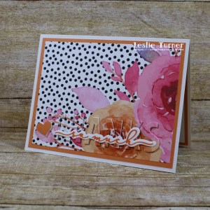 I began adhering the white die cut letters into the negative spaces on each background. After the first layer, I adhered the tiny triangular piece from the A (cut from the digital paper) into the negative space, and then proceeded with three more layers for some nice subtle dimension. Using the Waffle Flower Sentiment Additions Stamp Set, I stamped the second portion of the sentiment in Catherine Pooler Orange Peel ink, cut it with the coordinating Waffle Flower Sentiment Additions Die Set and adhered it over the raised letters. For each card, I punched one heart from the orange cardstock and three more from the 110# white cardstock, layered them together, and adhered it to the left of the sentiment.