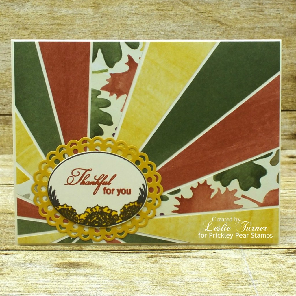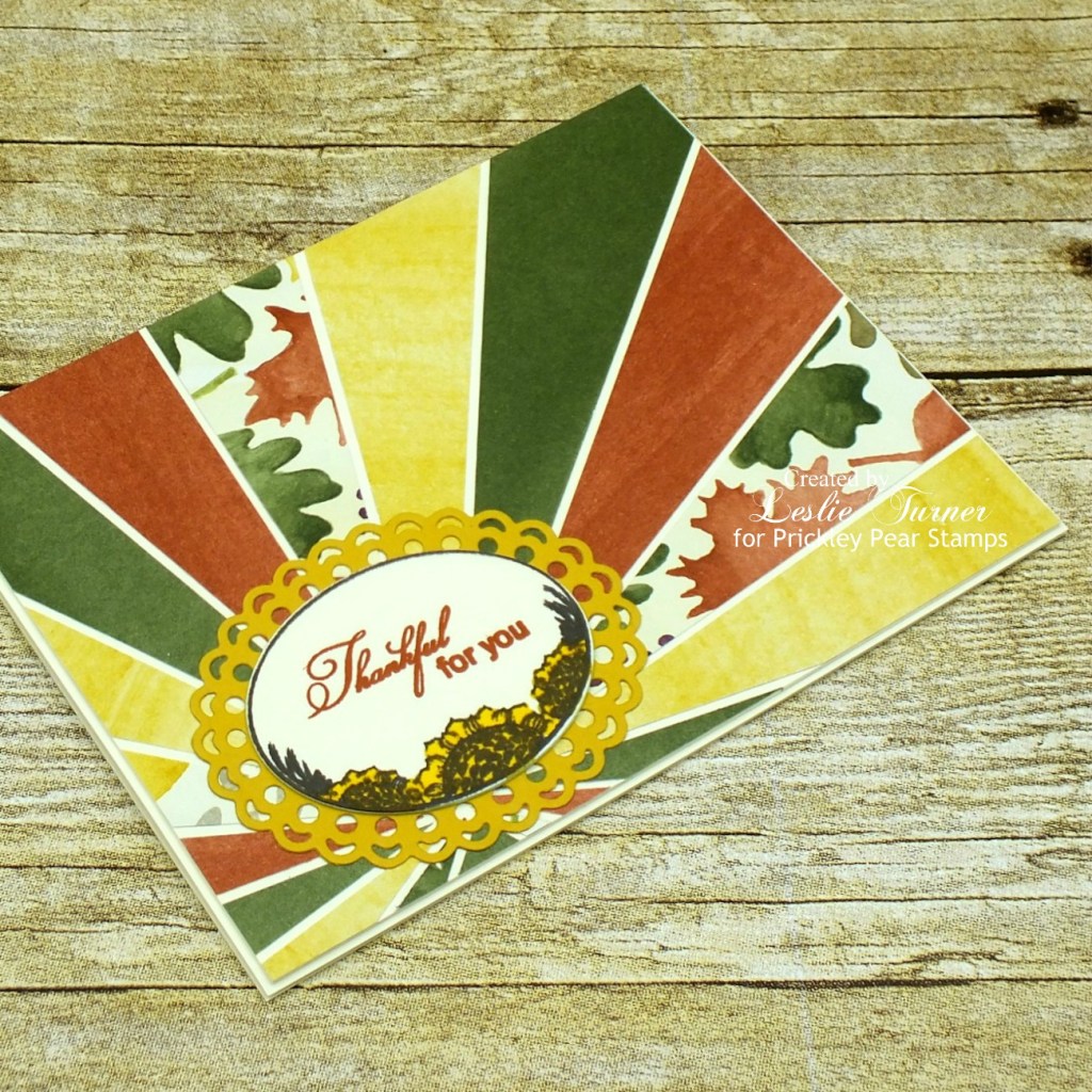 I cut a landscape A2 top-folding card base from ivory cardstock, then created a starburst background with an assortment of Fall papers. I stamped and die cut the oval, colored the sunflowers and layered it on a yellow Scalloped Oval die cut.