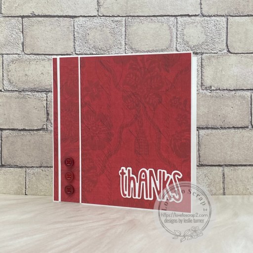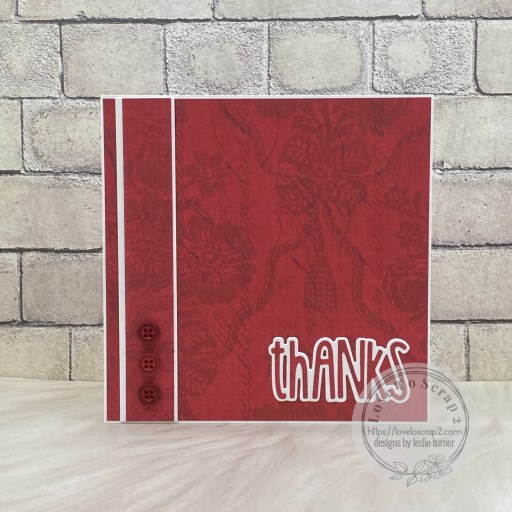 This 5″ square side-folding card base and embellishing strip were cut from Neenah Classic Crest 110# Solar White cardstock along with layering panels from a bold red print in the Spellbinders Flea Market Finds Floral 2 Palette paper pad. Using the Skinny Sentiments die set from STAMPlorations, I cut the sentiment letters from the red paper and the shadow from a Solar White scrap. The finishing touch was adding three buttons from the Buttons Galore & More Retro Christmas Buttons.