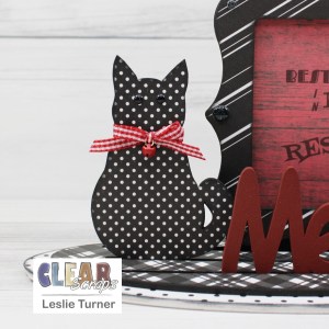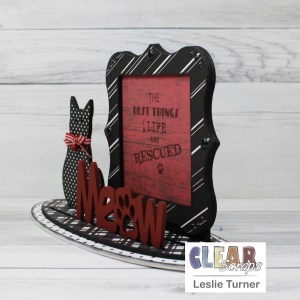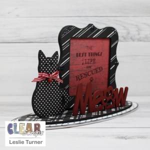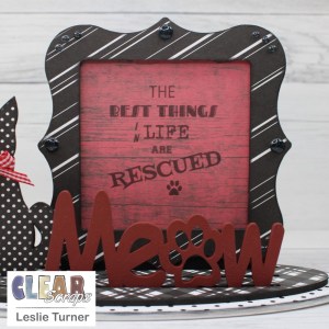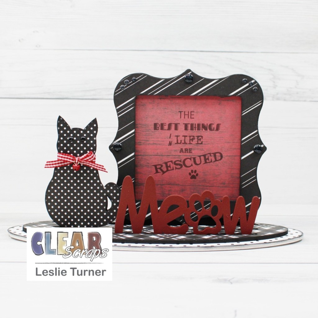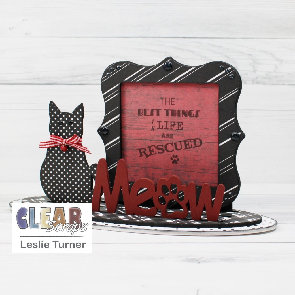 Hey, everybody! Hope you’re having a wonderful week and you’re not working too hard! I’m thrilled to be back on the Clear Scraps blog today with another awesome DT inspiration project! I had some 3-D Frameables fun with the Deco Frame and Meow-Cat Word n Shape and used a B&W + Red color combo which is one of my favorites! The 3-D Frameables are new in the store – you pick your frame and then you choose your theme. There are two base pieces (which attach to each other) which have long slots that the frame, word and shape fit into. This project is really close to my heart because my husband and I are ‘crazy cat people’ and we rescue. We have ten indoor fur babies with a catio and nine more outside (feral and semi-feral) with another catio in our fenced back yard!