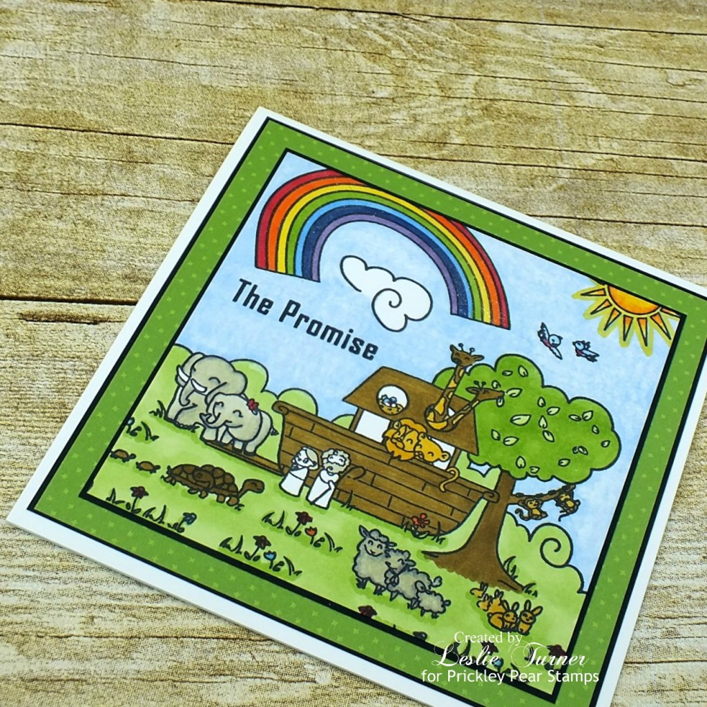 Howdy, everyone! Hope you’ve had a great week and you have some fun planned for this weekend! The weeks sure do seem to be flying by! I have another Prickley Pear Stamps website sample to share this morning. This sweet card was created with the super adorable Noah’s Ark clear stamp set. The main stamp is large and there are several smaller stamps to add details, and what a fun scene to color!