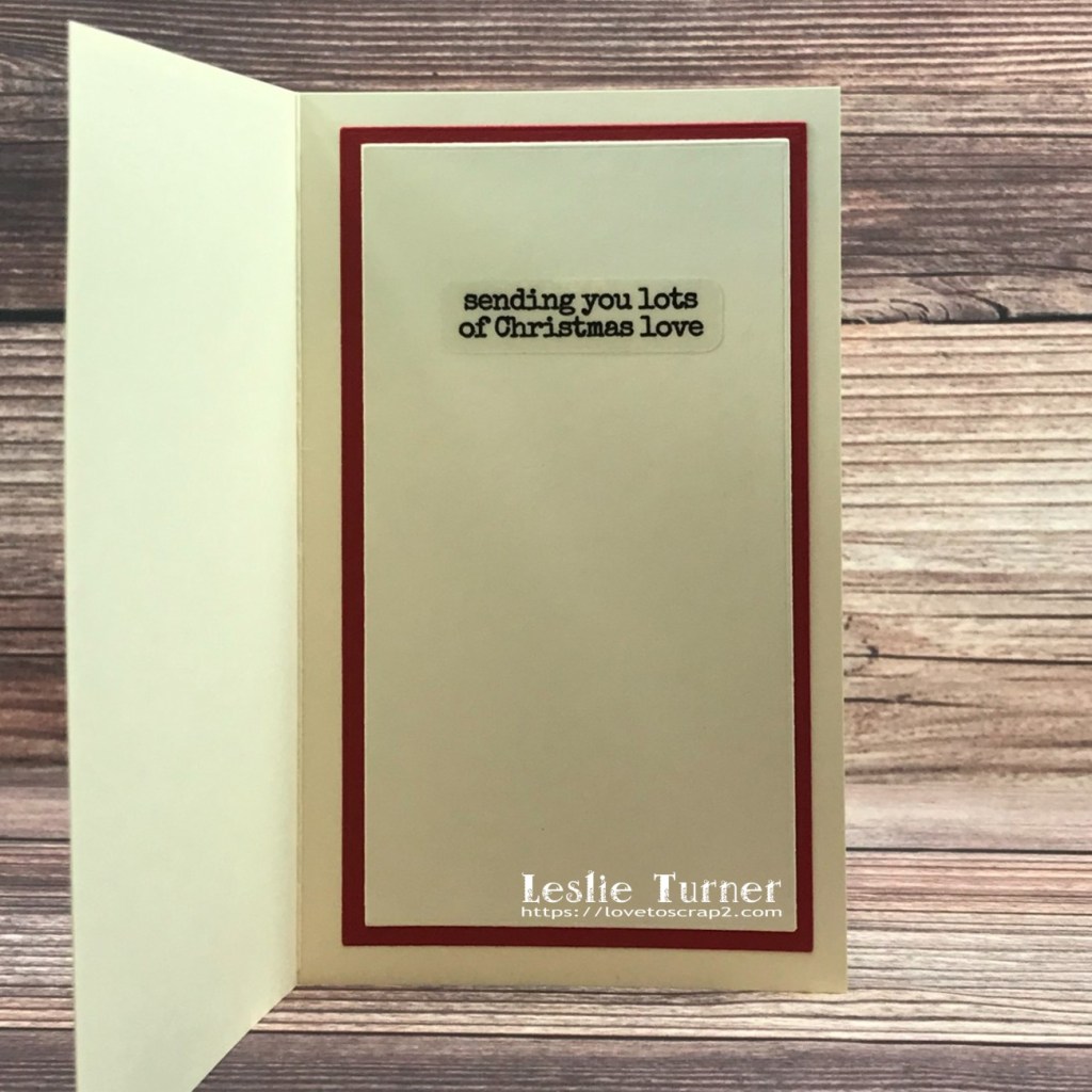 I cut the inside panel from Neenah Classic Crest Baronial Ivory cardstock along with a layering panel from CutCardStock Basis Red cardstock using the Waffle Flower Mini Slimline Layers dies and adhered them together, and then affixed a STAMPlorations Merry Everything Clear Sticker.