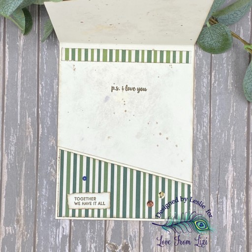 I embellished the inside with a 1/2″ x 4-1/8″ strip of the patterned paper which I distressed with the Walnut Stain distress ink, and then stamped a sentiment from the same stamp set in Rich Cocoa ink. For more details, be sure to visit the Love From Lizi blog to see my tutorial. ;)