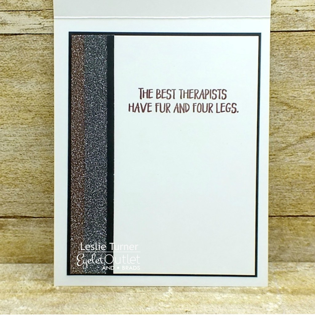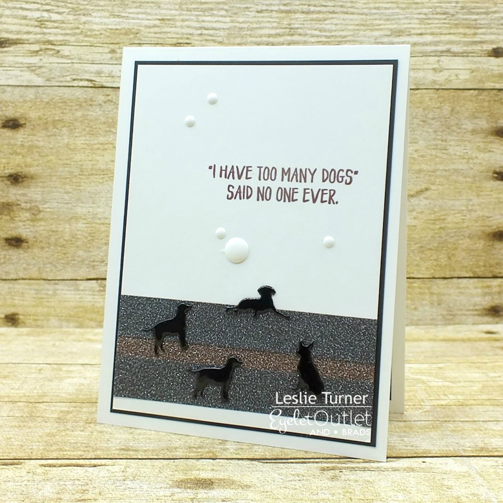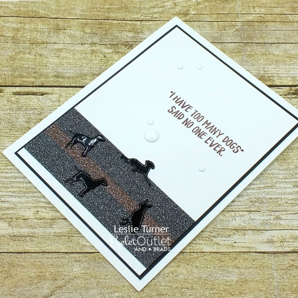 I decided to go with a brown and black color combo for this card. I put strips of Glitter Black Washi Tape and Glitter Brown Washi Tape horizontally across the bottom of the background panel. I stamped the sentiment in brown ink, added four Dog Brads and several White Enamel Dots, and then layered the panel on black cardstock and adhered it to the card base.