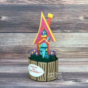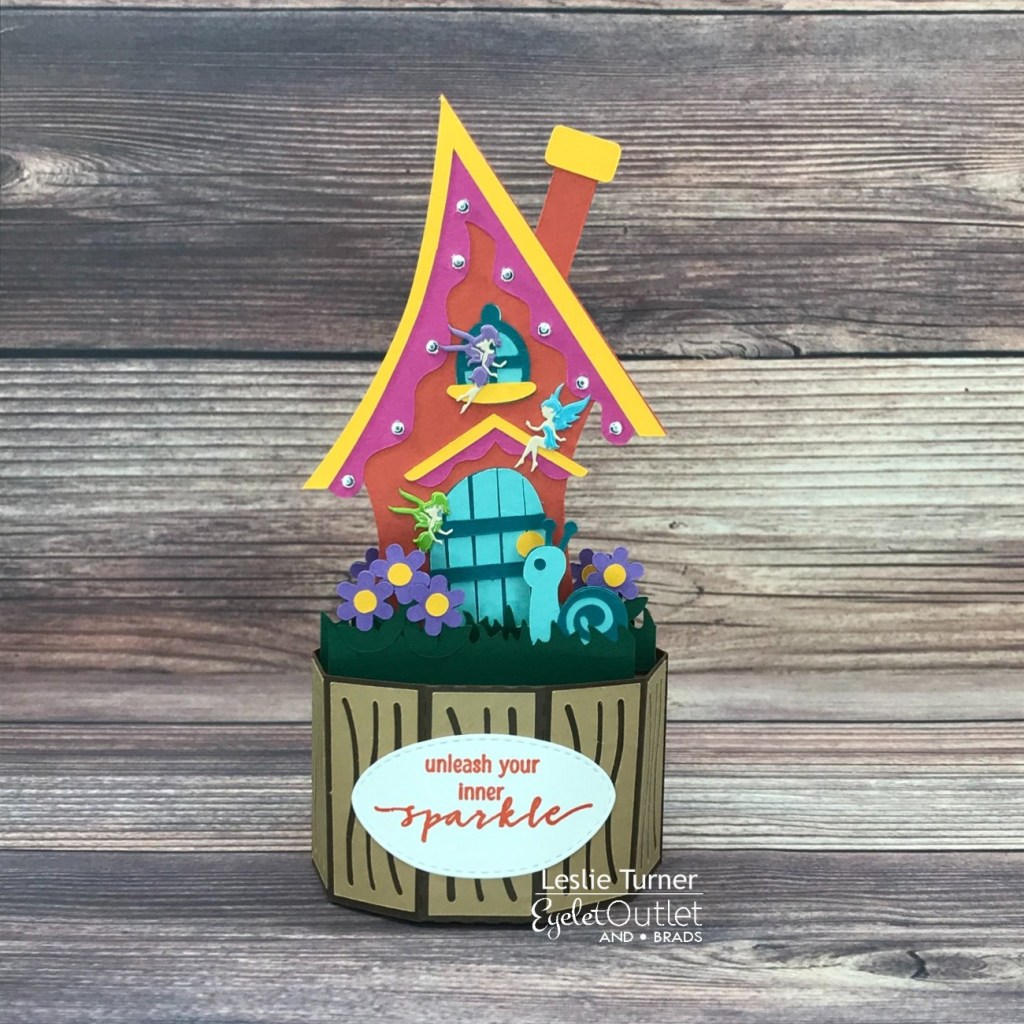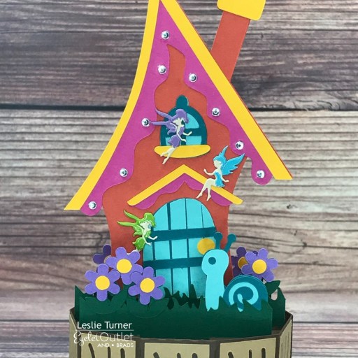 Hey peeps! A very Happy Saturday to you – I hope you’ve had a great week! They seem to be flying by at a wicked fast rate of speed! Affiliate links are used in this post at no cost to you – I really appreciate your support! I’m stoked to be back on the Eyelet Outlet blog today with another awesome DT inspiration project! I created the cutest-ever fairy house 3-D project featuring our Fairy Brads and clear gemstones from our Clear Jewel Bling Strips! I actually made two of these fairy houses with very subtle differences between the two – one had pink flowers and two fairies (which I sent to my granddaughter) and this one has purple flowers and and three fairies.