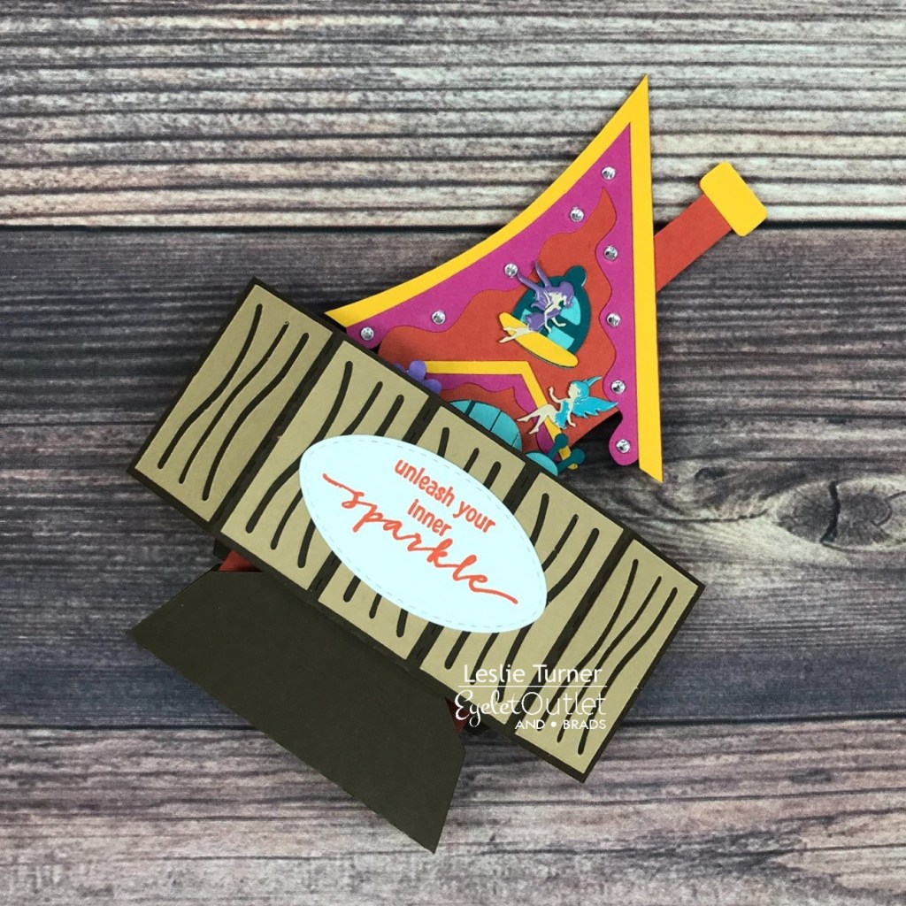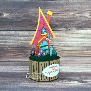 I cut all the pieces from CutCardStock Basis Brown, Basis Light Brown, Basis Green, Basis Aqua, Basis Teal, Basis Gold, Basis Magenta, Pop-Tone Tangy Orange and Pop-Tone Grape Jelly cardstock. I assembled the fairy house and added three Fairy Brads prior to adding the second base layer of the house for stability. I added several clear gemstones from our Clear Jewel Bling Strips to the soffit for a little sparkle.