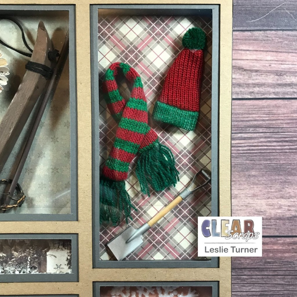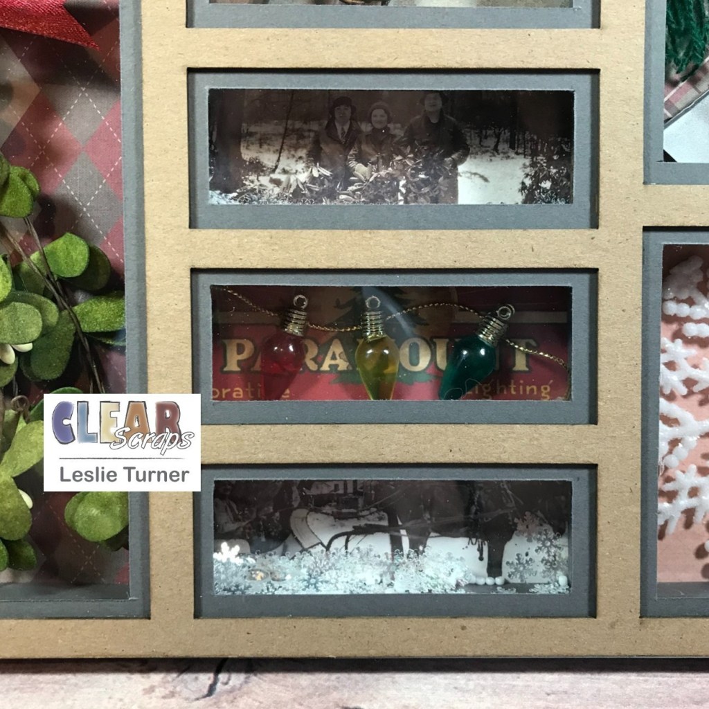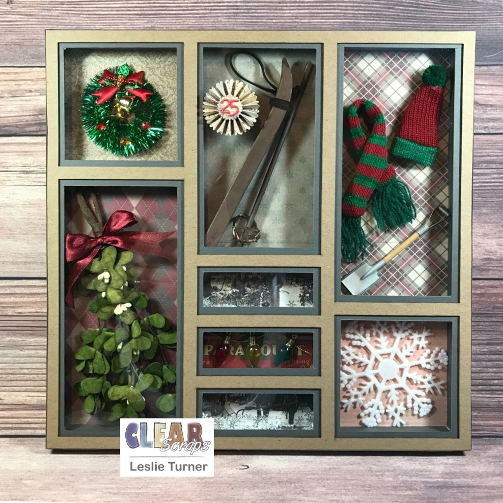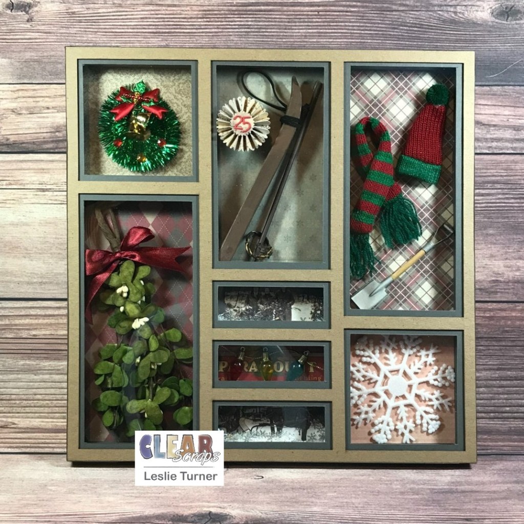 Hey, everybody! Welcome to another Monday closer to Christmas… it’s almost here! I hope you have all your Christmas crafting done or at least close to being done! I’m stoked to be back on the Clear Scraps blog today with another awesome DT inspiration project! I created a shadowbox from our Small Rectangle Printer Tray Frame, and I can’t tell you how much fun this was! I added several strips of double-sided adhesive foam tape between each of the chipboard layers so the compartments were deep enough to accommodate the vintage Christmas elements. I bought all of these fun vintage items (wreath, mistletoe, wood ski and pole, Christmas lights, scarf and hat, shovel, and snowflake) several years ago along with a different kind of shadowbox, and the shadowbox turned out to be too small, so everything just sat in my stash… until now!